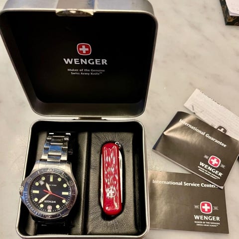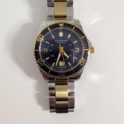 VICTORINOX SWISS ARMY, Maverick GS Large,Armbandsur, 2014 Quartzverk,Guld/Stål,Safirglas,Datum ;Ny krona med monogram,halvstel integrerad länk viklås Diam ca 42 mm mvh Alf Karlsson