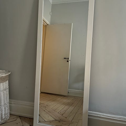 Helkroppsspegel med silverram köpt på Jysk.