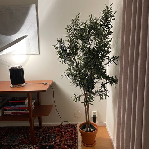 Konstgjord olivträd placerad i en svart kruka. Trädet har gröna blad och en detaljerad stam som efterliknar ett verkligt olivträd. Passar som dekorativ inomhusväxt.