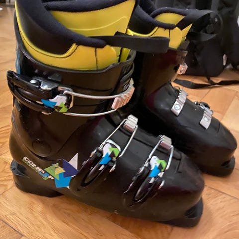 Slalompjäxor för barn, något slitna utanpå men gott skick inuti. Storlek 274 mm på utsidan, text innermått har försvunnit men är 22 cm vilket motsvarar ca strl 34.
