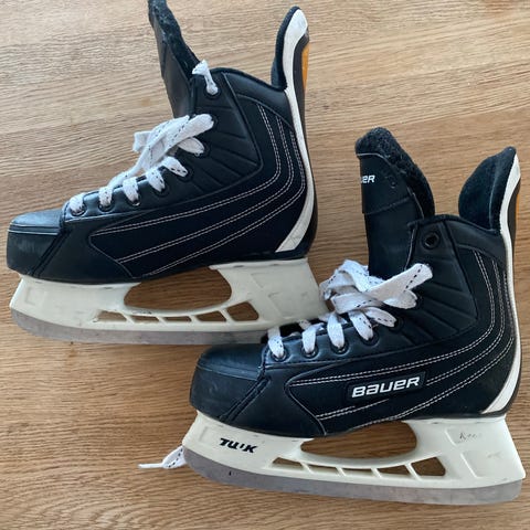 Säljer ett par barn skridskor. De är använda men i bra begagnat skick med många skär kvar att ge. Skydd enl bild ingår till varje par.