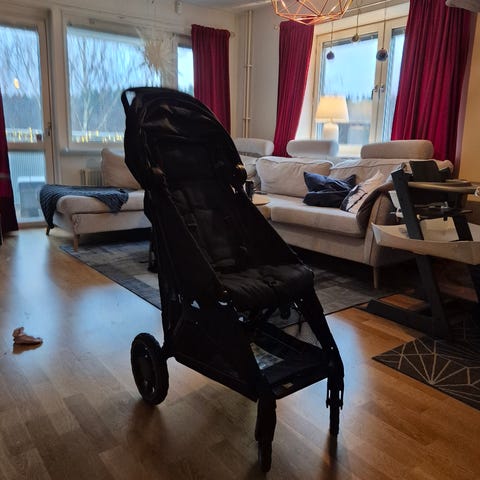 Emmaljunga barnvagn i svart färg. Vagnen har justerbart handtag, solskydd och är utrustad med fyra hjul för stabilitet. Den är hopfällbar för enkel förvaring och transport.