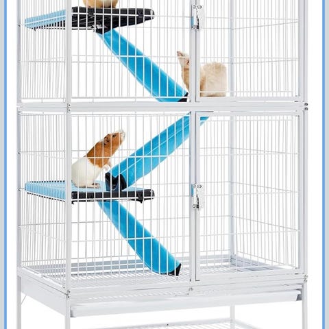 Råttbur / gnagarbur i svart metall med flera hyllor, ramper och dörrar, utrustad med hjul för enkel förflyttning. Burens design inkluderar avtagbara hyllor och ramper för rengöring och flera nivåer för djurens rörelse. Mycket robust.