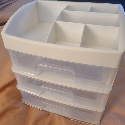 Praktisk sminkförvaring med flera fack och en låda. Perfekt för att organisera smink och andra småsaker. 2st