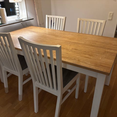 Bordet är använt men i fint skick och står stadigt. Perfekt för stora middagar, familjesammankomster eller dig som vill ha en rejäl möbel som håller länge.