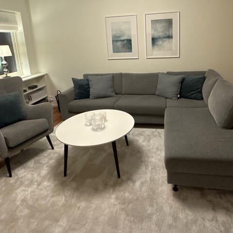 Rymlig soffa i grå sammet med schäslong - bra skick!