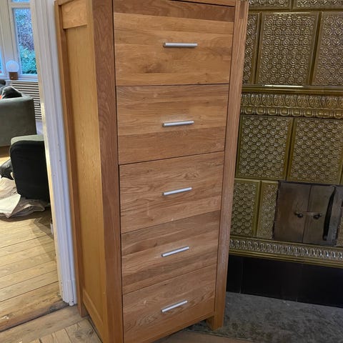 Byrå med fem lådor i trä, vitmålad med synliga slitage och färgskador. Se bilder för mått.