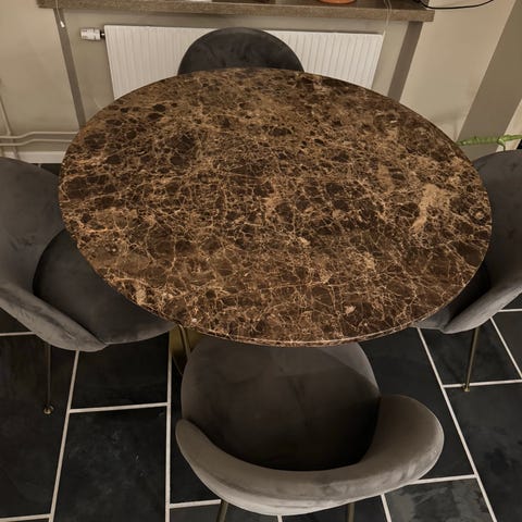 Stolar i mycket fint skick, bordet också men har lite små "ringar" som uppstår i äkta marmor över tid, men inget som man stör sig på.