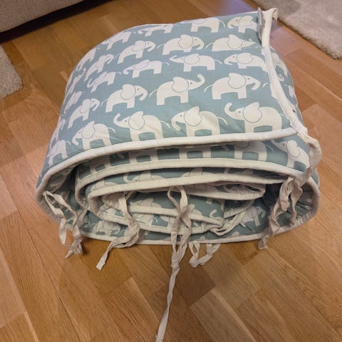 Skydd till barnsäng. Spjälskydd men utan möjlighet att knyta fast så vi har mest använt det när barnet var lite större. Tror det är av märket Rätt start, men hittar ingen märkning nu när jag tittar. Några ytliga fläckar, men knappt använt av oss.