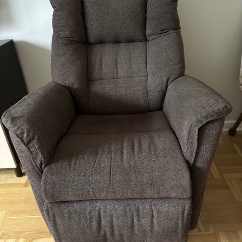 Två sköna fåtöljer med reglerbar rygg och tillhörande fotpallar. Fåtöljerna är rejäla och sköna att sitta i. Har smärre skönhetsfläckar på träet vid armstöden. 2000 kr/ för bägge (2 fåtöljer och 2 fotpallar). Från Mio Möbler, IMG Scandinavia
