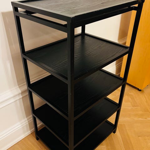 Svart vägghylla med tre hyllplan som ger praktisk förvaring av tillbehör till TV.