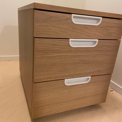 Tre större svängda skrivbord från Ikea med tillhörande hurtsar. Skicket är bra.