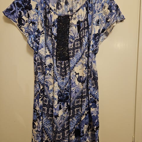 Helt ny flerfärgad snygg sommartunika, (Cappuccino)beige/brunt tyg med "guld dekoration vid halsringningen samt knytband. 3/4 ärm med dragsko nedre delen, resår vid ärmslut.