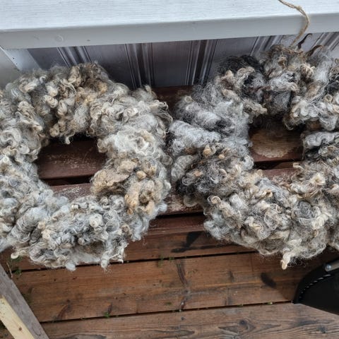 Ullkrans med stomme av halm och lockar från gotlandsfår. Handtovat vante och sidenband.