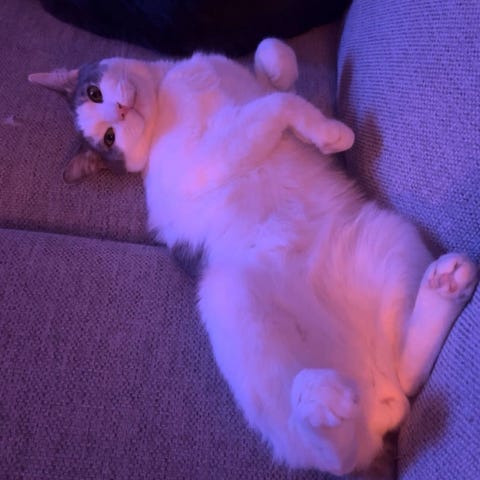 Han älskar att gosa i famnen, favoritplatsen att somna till på är i luvan framför tv:n och Hör han kylskåpet samt prassel så sjunger han högt och fint🥰