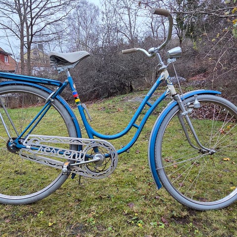 Fin cykel som gjordes i samband med Tour d europe från crescent. Den är på 28" hjul med växlar fram och bak 2x5 st. Fram och bakbroms på styret som tar bra. Alla växlar funkar fine. Överlag, jättehäftig cykel med historia!