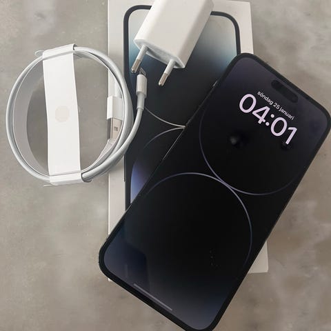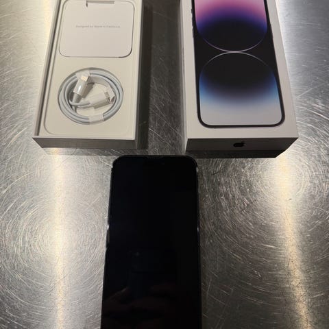 Apple iPhone 14 Pro mobiltelefon med 256 GB lagringskapacitet i svart färg. Enheten har en modern design med skärm fram och kamera på baksidan. Passar för användare som söker en smartphone med hög lagringskapacitet och avancerade funktioner. Inga skador batteri nivå 78%
