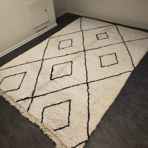 Skapa en varm och stilren känsla i ditt hem med en handknuten Beni Ourain-matta, tillverkad av naturlig, obehandlad ull av berberkvinnor i Atlasbergen.
