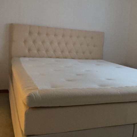 Dubbelsäng i beige chenille 180x200 cm med gavel och avtagbara kuddar.