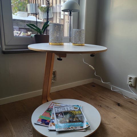 Säljer ett runt sidobord med hjul. Skivorna är i glas.