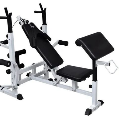 Gymmaskin utrustad med viktmagasin och en bänk med vadderad sitt- och ryggplatta. Maskinen har metallram och är avsedd för styrketräning med justerbara vikter. Bänken är klädd i svart material och har fotstöd för stabilitet under träning.