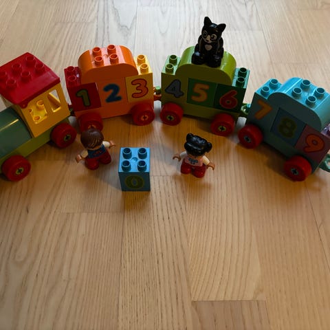LEGO Barnvagn som innehåller Duplo byggklossar i olika färger. Vagnen är röd med blå och gula detaljer och har hjul för enkel förflyttning. Passar för barn och är avsett för lek och byggande.