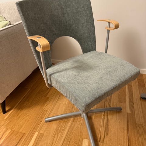Kontorsstol i grått tyg med justerbara armstöd och hjul. Stolen har en hög rygg för stöd och är lämplig för kontorsmiljöer eller hemmakontor.