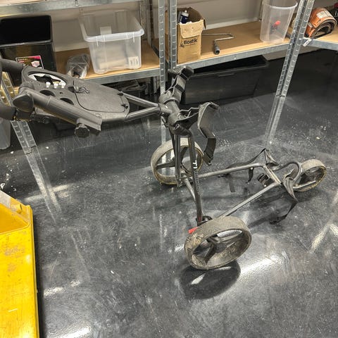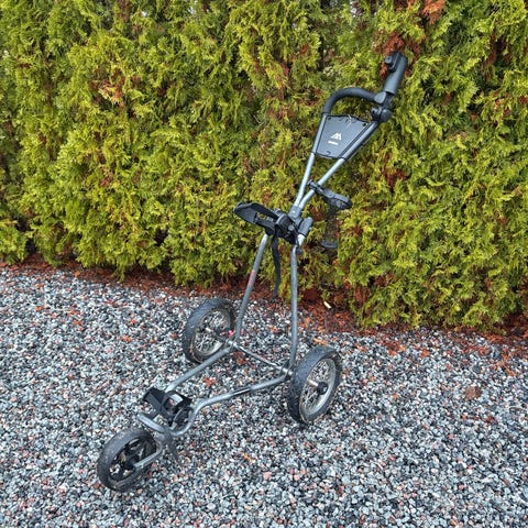 Hopfällbar fin golfvagn i svart färg. Utrustad med tre hjul och handtag med förvaringsfack och mugghållare. Lämplig för att enkelt transportera golfbagen på golfbanan. Perfekta julklappen 😊