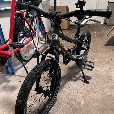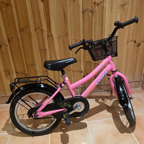 Säljer en flickcykel i storlek 16”. Utrustad med Hand och fotbroms, korg och även stödhjul följer med.