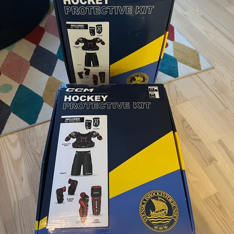 CCM Ishockeyutrustning barn Set inklusive skyddshandskar, byxor och axelskydd i svart och rött samt hjälm. Utrustningen är avsedd för ishockey. Nypris ca 2300 kr. Skridskor finns även till försäljning.