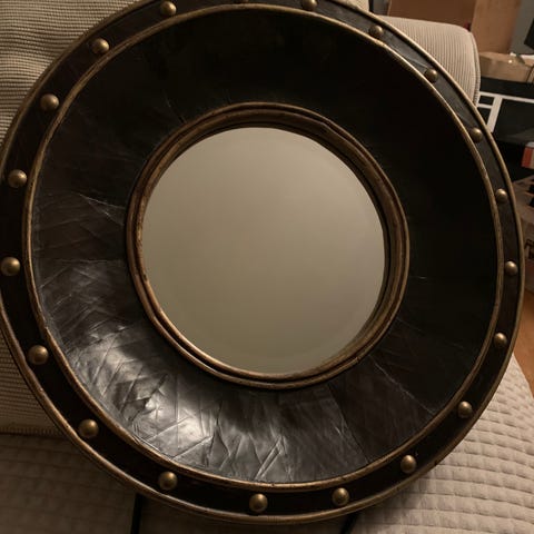 Snygg spegel i skin/mocka imitation. Snygga detaljer med vit söm. Kan hängas både stående och liggande.