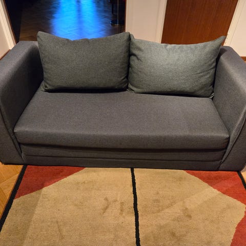 2,5-sits soffa med tygklädsel. Sittdyna och rygg i skum. Ben i massivt trä. B170 x H82 x D81 cm, några fläckar som enkelt kan tas bort med rengöringsmedel.