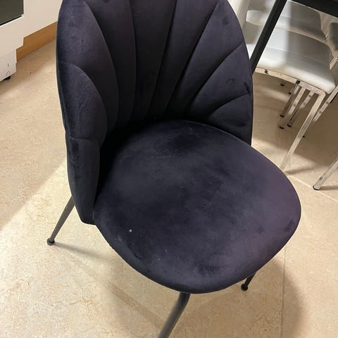 Fyra stilrena matstolar i blå sammet med ben i mässing. I bra skick. Ser lite gråa ut på bilden, men de är marinblå.