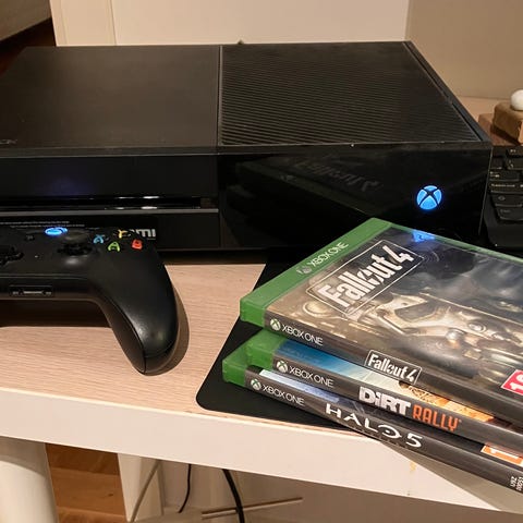 Xbox One spelkonsol inklusive en handkontroll. Konsolen levereras med tre spel, Call of Duty Battlefield 1 och FIFA 24. Spelen är i originalfodral och är avsedda för Xbox One-plattformen