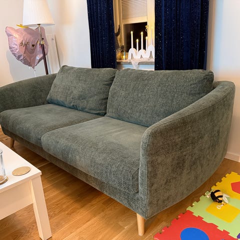 Varsamt använd, haft filt på hela tiden (som synes på bild). Avtagbar klädsel på kuddarna ej stommen.