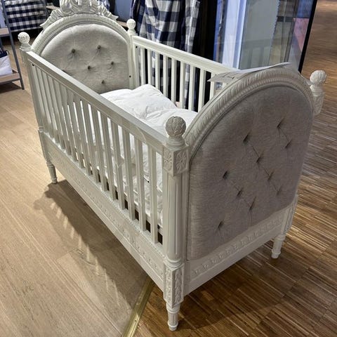 Mangelkorg i rotting, som enkelt läggs på en tillhörande ställning. Tyget är från 60- eller 70-talet. Madrass medföljer.