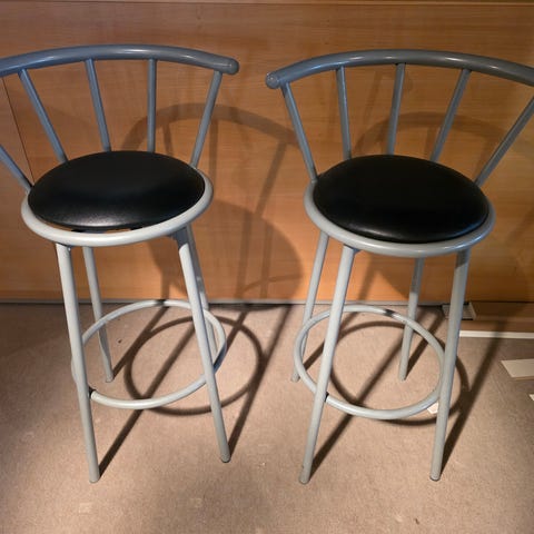 Säljes i begagnat skick med normala bruksspår, stomme i silvergrå metall med fotstöd runt om och mörkgrå sittyta i tyg.