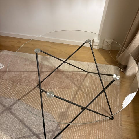 Dubbelglas yta med svart marmor mönster på översta delen. Svarta metal ben med guldiga fötter.