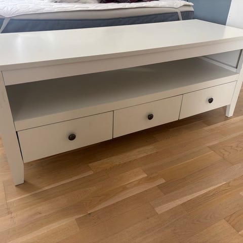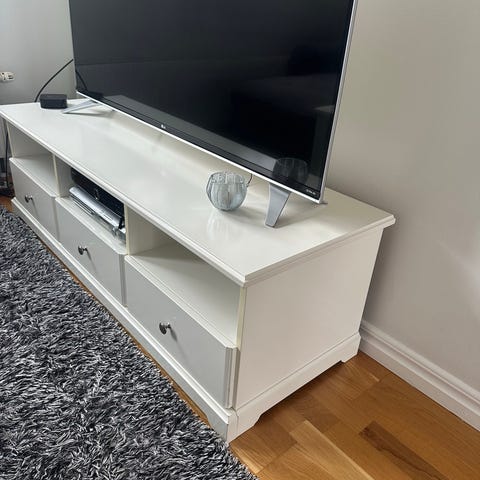 Jysk tv-bänk i vit färg. Modellen har en öppen hylla under topplattan samt tre lådor med runda knoppar längst ner, vilket ger plats för förvaring av exempelvis mediautrustning, fjärrkontroller eller annat tillbehör. Tv-bänken är avsedd att stå mot vägg och passar för tv och mediaenheter i vardagsrum eller liknande utrymme.