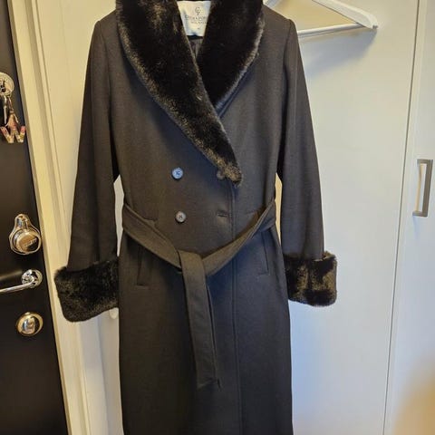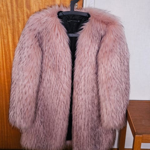 Säljer en lång beige kappa från Alcantara i mocka med huva och snygga träknappar. Insidan är fodrad med mjuk zebramönstrad fusk päls som ger extra edge och värme. Perfekt för dig som vill sticka ut med coola detaljer och unik look.
