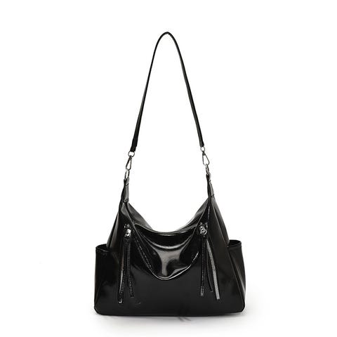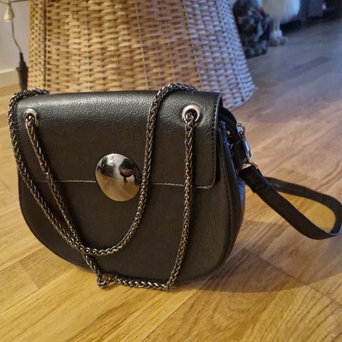 Brun handväska med justerbar axelrem och magnetisk stängning. Väskan har ett fack med dragkedja inuti.
