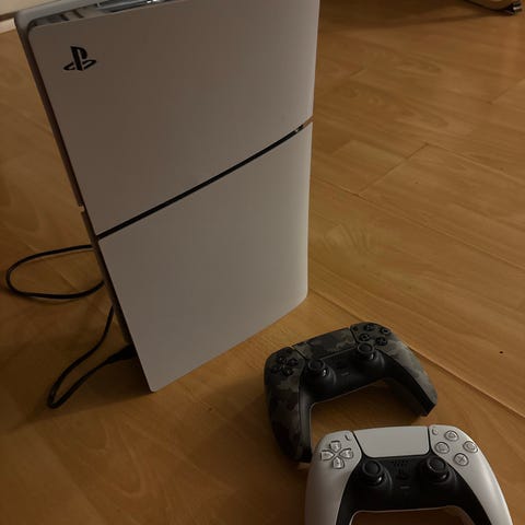 Sony PlayStation 5 spelkonsol med två vita och en svart DualSense trådlösa kontroller inkluderar även ett par trådlösa hörlurar. Inkluderar hdmi sladd laddare till kontrollerna kan laddas två åt gången