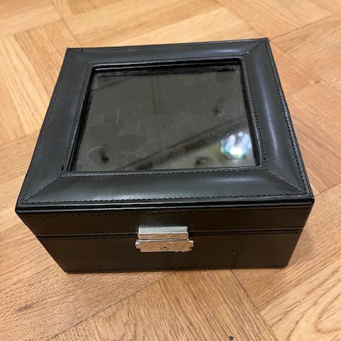 Lyxig klocklåda med en mjukt vadderad exteriör dekorerad med vita stygn, ljus sammetslen interiör av mocka och ett genomskinligt lock av akryl för att kunna beskåda samlingen medan lådan är stängd. Rymmer 6 st armbandsklockor som träs runt en liten kudde