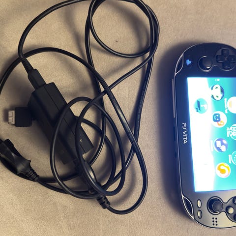 Sony PS Vita spelkonsol i svart färg. Bärbar spelkonsol som också kan spela PSP-spel och PS1-spel. Produkten levereras med originalförpackning och tillbehör inklusive minneskortadapter för micro SD.