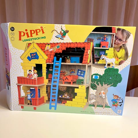 Pippi Långstrump lekset som inkluderar Villa Villekulla i trä med röda tak, gula väggar, blå dörrar och blå stege utanför samt röd stege inne i huset.