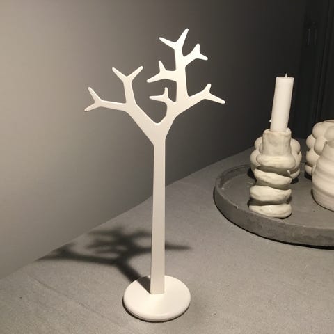 Smyckesträd i gul metall med flera grenar för upphängning av smycken. Passar för organisering och förvaring av smycken såsom halsband, armband och örhängen.