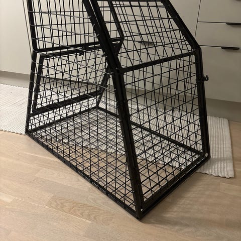 Hundbur tillverkad av Robust hundburar. Mellanvägg medföljer. Buren har en hel gallerdesign som ger god ventilation. Passar för att säkra hundar under bilresor. Färgsläpp på sina ställen men fyller sin funktion.