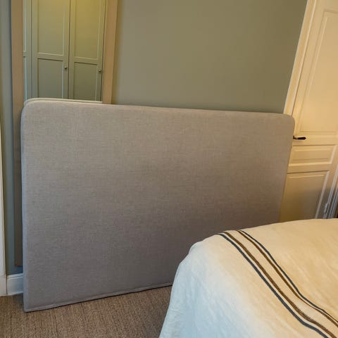 Sänggaveln saknar ben men går att sätta på vilka som man önskar, om man önskar några.