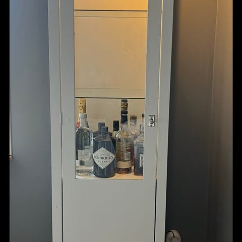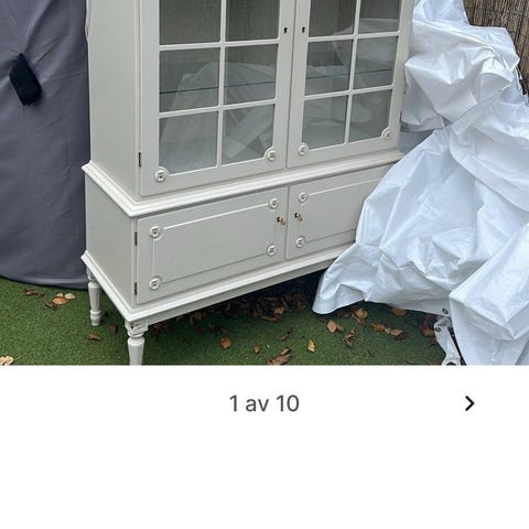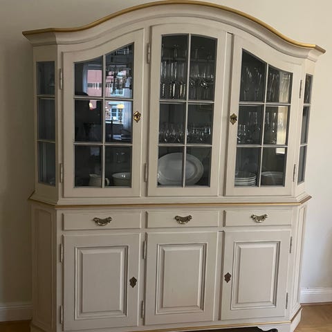 Skåp i antikgrått. Nederdelens skåp har utdragbar besticklåda och två hyllplan vardera. Mått 177x104x42 cm.