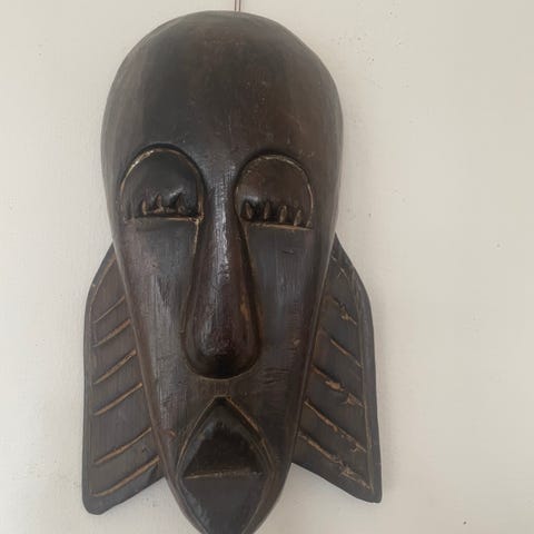 Antik / vintage Afrikansk trämask från Ghana med rund form och mönstrad yta. Masken har utskurna ögon och mun samt detaljer i olika trätoner. Används för dekorativa ändamål eller kulturella sammanhang.
